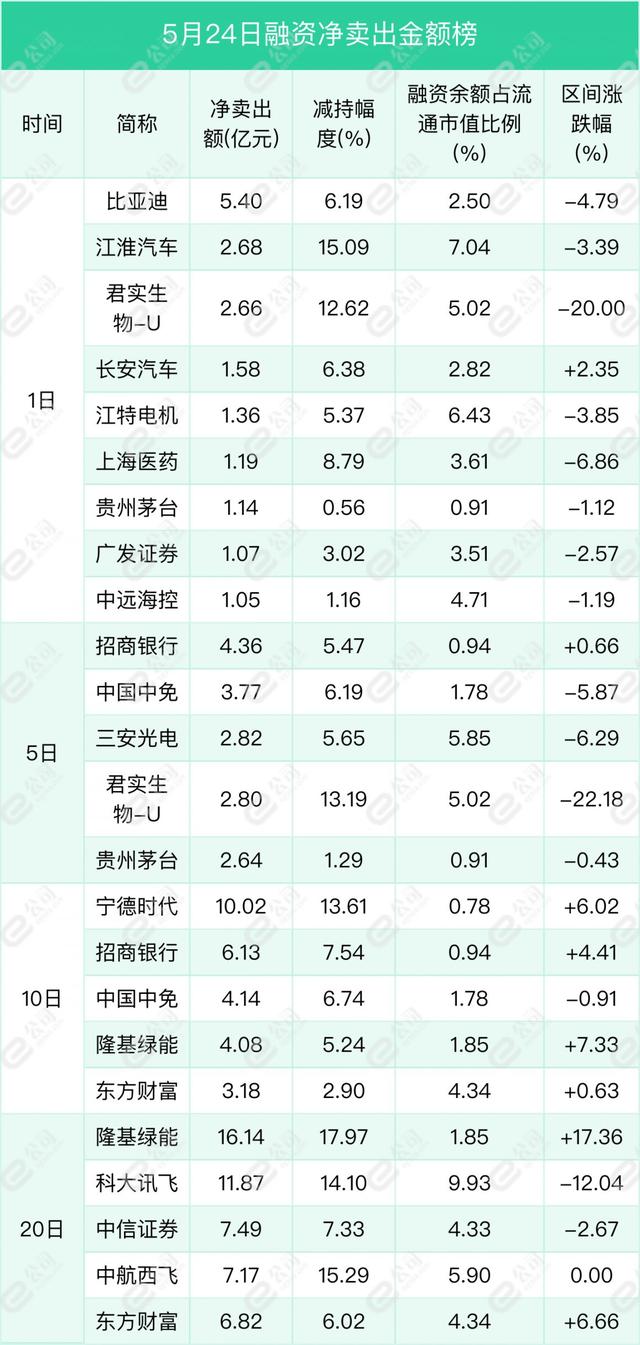 比亚迪、江淮汽车、君实生物-U遭融资净卖出金额居前,分别为5.4亿元、2.68亿元、2.66亿元,减持幅度分别为6.19%、15.09%、12.62%。