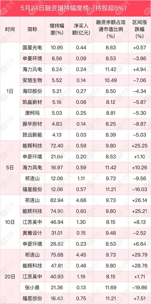 从增减持幅度来看,融资余额占流通股比例超8%的个股中,国星光电、申菱环境、海力风电获融资增持幅度居前,分别为10.95%、8.56%、6.24%。