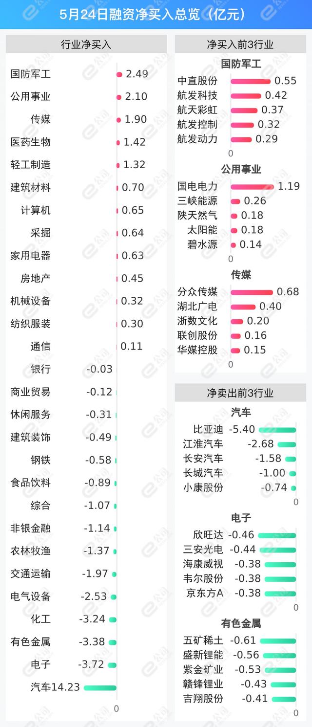 国防军工、公用事业、传媒获融资净买入金额居前,分别为2.49亿元、2.1亿元、1.9亿元。