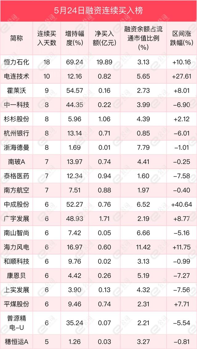 从连续买卖来看,恒力石化、电连技术、霍莱沃获融资连续净买入天数居前,分别为18天、10天、9天,期间净买入额分别为19.89亿元、0.82亿元、0.16亿元,期间增持幅度分别为69.24%、12.16%、54.57%。