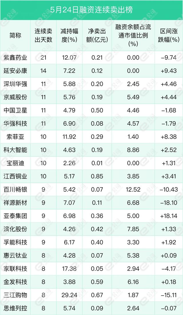 紫鑫药业、延安必康、深圳华强遭融资连续净卖出天数居前,分别为21天、14天、11天,期间净卖出额分别为0.21亿元、0.12亿元、0.2亿元,期间减持幅度分别为12.07%、7.22%、5.88%。