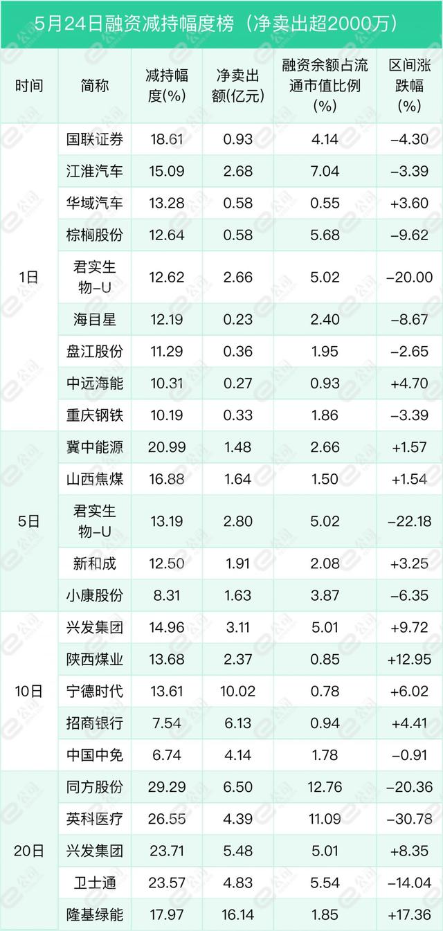 国联证券、江淮汽车、华域汽车遭融资减持幅度居前,分别为18.61%、15.09%、13.28%。