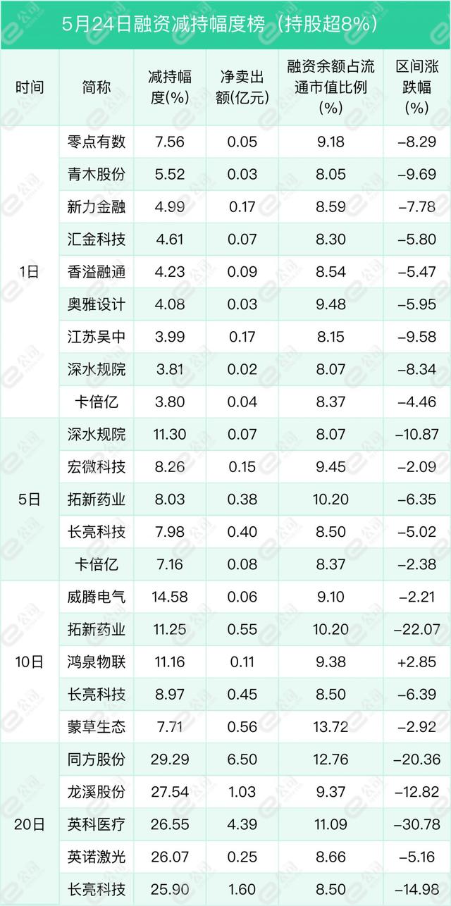 零点有数、青木股份、新力金融遭融资减持幅度居前,分别为7.56%、5.52%、4.99%。