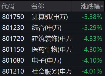 其中,计算机、综合板块领跌,均跌逾5%,分别下行5.38%和5.39%。建筑装饰、医药、电子、社会服务等板块,均跌超4%,分别下行4.33%、4.30%、4.10%、4.01%。