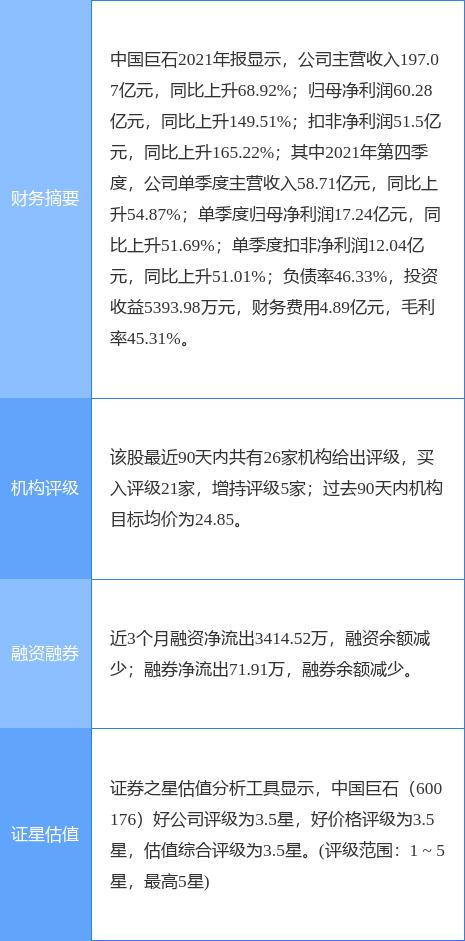 本文摘要:今日中国巨石(600176)涨5.78%,收盘报16.3元。2022年3月24日,东方证券研究员黄骥,余斯杰发布了对中国巨石的研报《中国巨石21年年报点评:业绩再创新高,周期波动有望降低》,该研报对中国巨石给出“买入”评级,认为其目标价为2… …