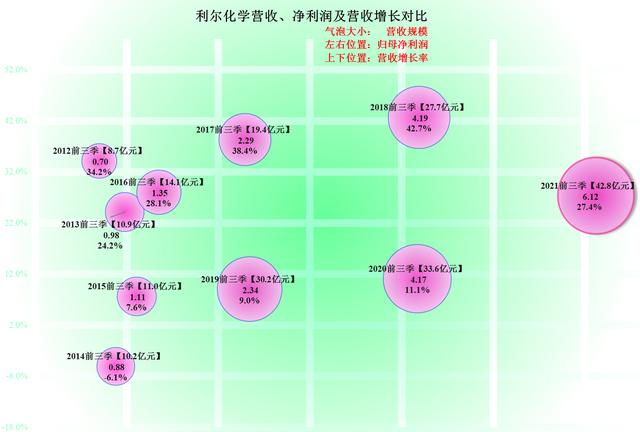 从气泡图来看,2021年前三季度,利尔化学的营收和净利润都是创下了历史新高,只有营收增长率处于中间水平,气泡位于最右侧偏上的位置,这和其他很多同类企业都处于右上角相比,利尔化学略微显得差一些。