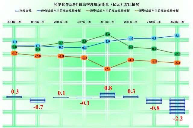 最后是现金流量情况,利尔化学的现金流量表现也不错,持续8个前三季度都有经营活动的净现金流入,但同样是持续8个前三季度都有比经营活动净现金流更大的投资活动需求,所以还必须进行一定的净融资来补充。杠杆也就是在这些时候加上去了的,只是利尔化学经营还算是稳健,杠杆加得比较慢,并结合着自身的经营积累来进行,也就没有导致太多的风险暴露。