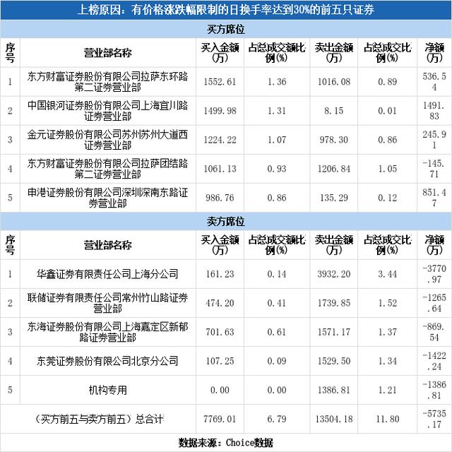 买一为东方财富证券拉萨东环路第二证券营业部,该席位买入1552.61万元,卖出1016.08万元,净买额为536.54万元。近三个月内该席位共上榜1373次,实力排名第5。东方财富证券拉萨东环路第二证券营业部今日还参与了宁波海运(净买额3610.31万元),浙江建投(净买额1543.46万元),诚达药业(净买额1248.04万元)等27只个股。
