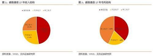 盛路通信(002446,股吧)成立于1998年,是国内第一家天线制造类上市公司,也是国内规模最大、技术最先进的民用通信天线和微波通信天线制造商之一。上市后公司以外延并购的模式,通过资产重组进行频繁的资本扩张。2014年公司收购合正电子切入汽车电子的其他细分领域,2015年收购南京恒电获取军工牌照,目前已发展成通信设备、汽车电子、军工电子等领域一体化运作的集团公司。其中老牌通信业务贡献接近一半的收入,而军工电子依赖于自身超过60%的毛利率,因此对利润的贡献相对更高。