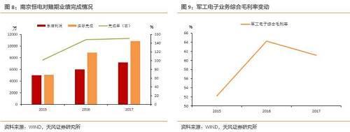 军工业务为少有亮点,民企经营牌照较为稀缺。2015年公司收购南京恒电,原股东作出业绩承诺,2015—2017年扣非净利将分别不低于5000万、6000万以及7200万元。2016年以来在军改冲击、企业订单下滑的大环境中,南京恒电业绩超出市场预期,(16年、17年实际完成8878万、1.085亿),同时单位盈利能力也有显著提升,预计随着军改对企业的负面影响逐步消除,军品交付将进入相对景气周期。而南京恒电作为国内少数具备为军工客户提供微波子系统研制生产能力的民营企业,拥有显著的先发优势,且由于军品的特殊性,行业本就是非市场化的竞争,市场准入有一定的刚性门槛,在此情况下民企的稀缺性将使其更为受益于军民融合的推进。