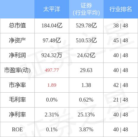 太平洋主要指标及行业内排名如下: