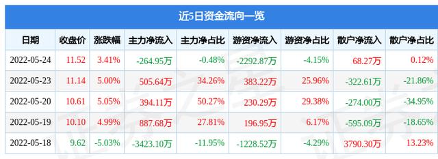 资金流向数据方面,5月24日主力资金净流出264.95万元,游资资金净流出2292.87万元,散户资金净流入68.27万元。