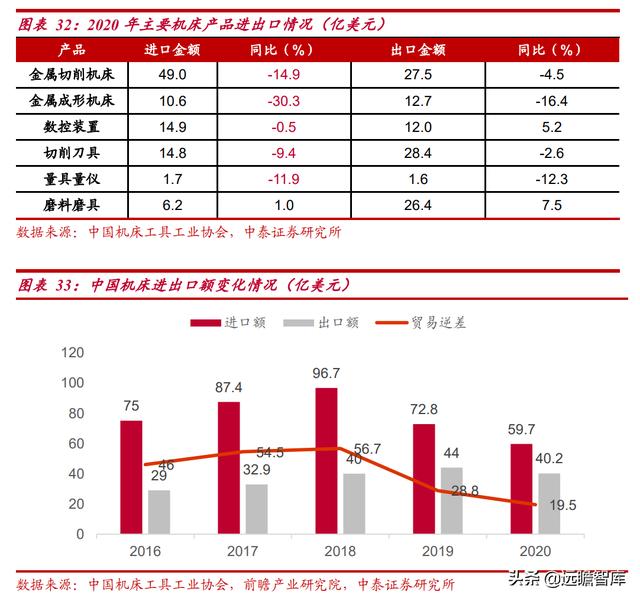 自 2018 年,随着国际贸易形式发生转变,机床的进口市场显著下降,从 2018 年的 96.7 亿美元降至 2020 年的 59.7 亿美元,贸易逆差从 56.7 亿美元降至 19.5 亿美元。