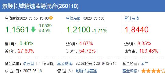 此后,景顺长城精选蓝筹基金再没有面临净值亏损的状况,虽然也从1.432元逐步回落到1.1元附近甚至更低,但基金一直保持盈利。到2020年3月初,景顺长城精选蓝筹基金的累计净值已经高达1.938元,目前这只当年火爆发行的超大规模网红基金累计收益率超过100%。