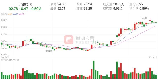 宁德时代今日下跌0.50%,股价为92.78元,成交金额为9.69亿元,成交10万手,换手率为0.86%。