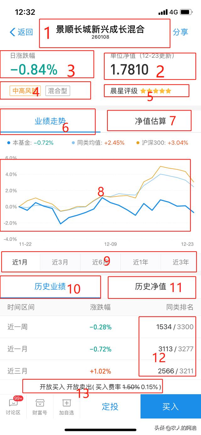 红框12 同类排名,在同类基金的排名情况,不同时间段排名不同。