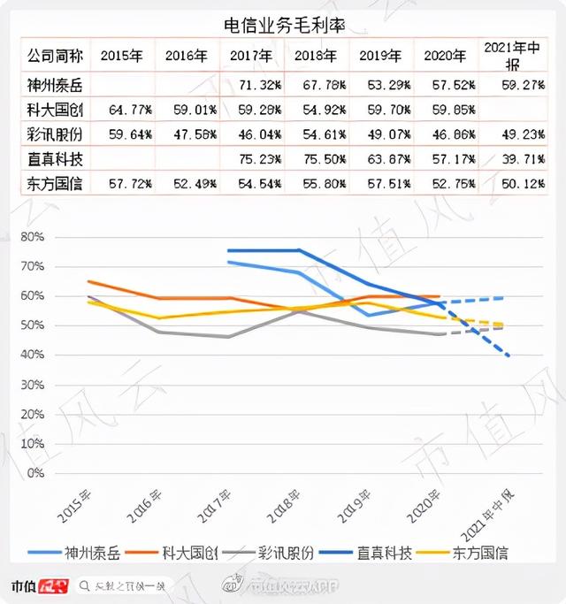 整体看,它们的毛利率水平在50%至60%之间。其中,东方国信相对比较稳定,高于50%,但低于神州泰岳和科大国创;彩讯股份略低于50%;直真科技在2021年上半年下降幅度很大。