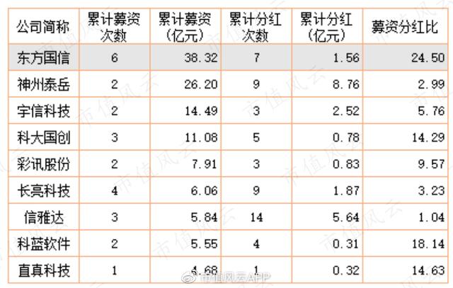 在本文所比较的9家公司中,东方国信的累计股权募资金额最高,但分红金额却不匹配,甚至可以用吝啬来形容,募资分红比高达24.5。