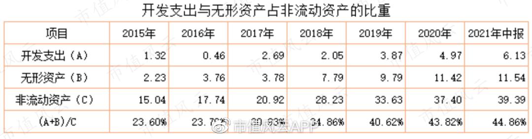 东方国信的财务数据上也是如此,其无形资产与开发支出,在2015年时候仅仅是3.6亿元,但到2021年上半年达到17.6亿元,增长了近4倍,二者已占到当期非流动资产的45%。