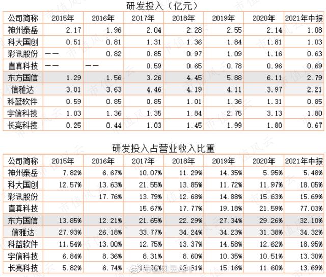 从研发投入占营业收入比重来看,东方国信呈现明显上升态势,2021年中报达32%,高于除信雅达、直真科技外的其他公司。