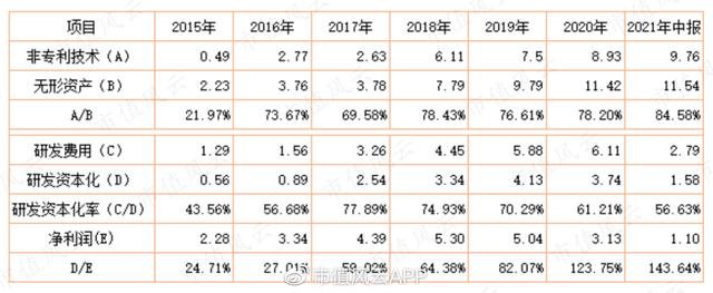 比较有意思的是,2017年以来,研发资本化金额与净利润的比值接近或超过60%,2020年、2021年上半年均超过100%。