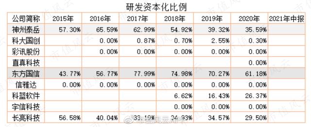 从上表可清晰看出,在9家公司中,东方国信的研发资本化比例最高。