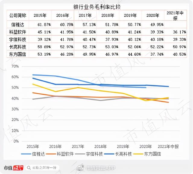 从毛利率看,东方国信银行业务的毛利率呈现下降趋势,最近两年在40%上下,与科蓝软件、宇信科技非常接近,但比长亮科技、信雅达低10个百分点,差距比较大。