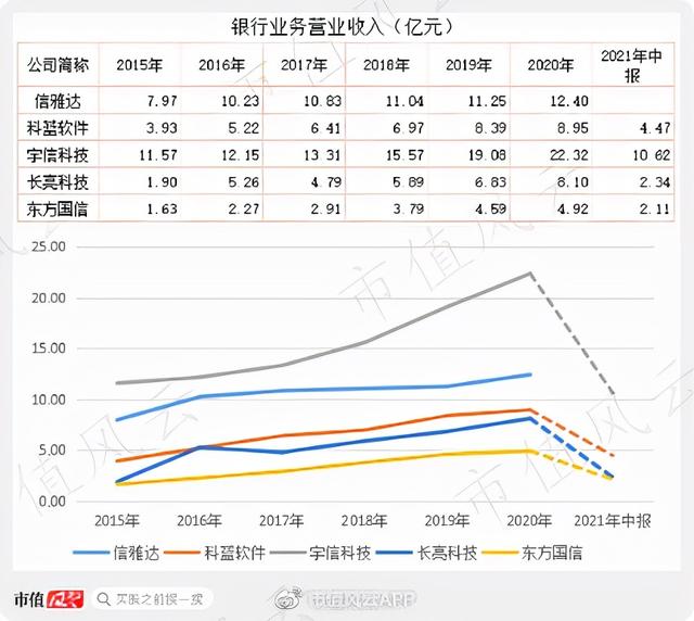 在5家可比公司中,东方国信的银行业务收入规模最小,2020年还不到5亿元。