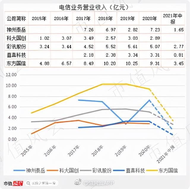 但需要注意的是,这5家公司的电信业务营收规模,在2019年以来几乎没有增长,比较明显的是东方国信、直真科技、彩讯股份、科大国创。