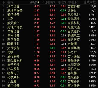 板块方面,东方财富86类行业有47类上涨,风电设备、房地产服务、通信设备、中药、航天航空、房地产开发等6类行业居前,涨幅均超2%。