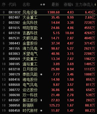 周三,风电设备股走强,截至收盘,板块大涨4.03%,居东方财富行业涨幅榜首位。其中,吉鑫科技与大金重工报收于涨停。