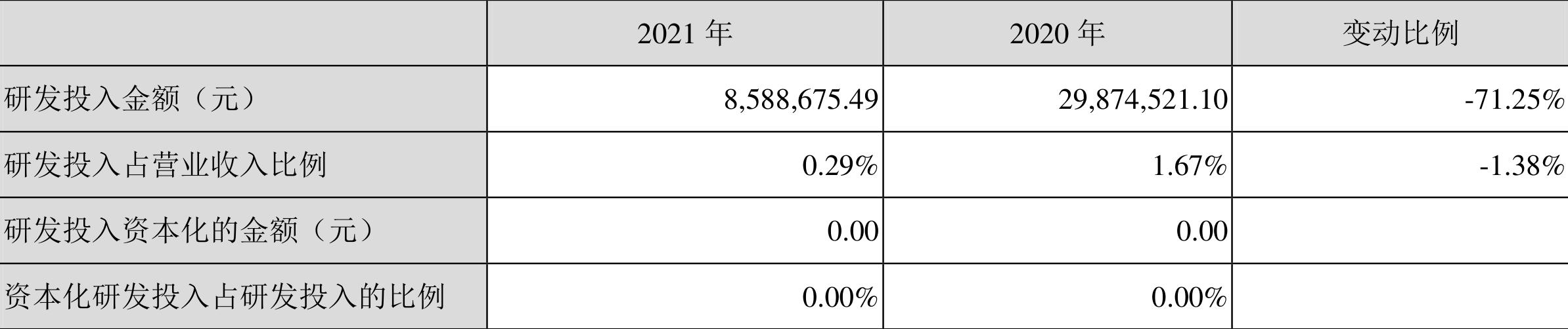 2021年全年,公司研发投入金额为858.87万元,同比下降71.25%;研发投入占营业收入比例为0.29%,相比上年同期下降1.38个百分点。此外,公司全年研发投入资本化率为0。