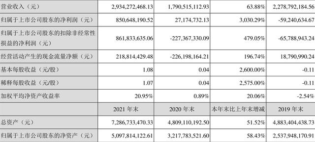 中证财讯 盛新锂能(002240)3月29日披露2021年年度报告,公司实现营业总收入29.34亿元,同比增长63.88%;归母净利润8.51亿元,同比增长3030.29%;扣非净利润8.62亿元,同比扭亏;经营活动产生的现金流量净额为2.19亿元,上年同期为-2.26亿元;基本每股收益为1.08元,加权平均净资产收益率为20.95%。拟向全体股东每10股派1元(含税)。