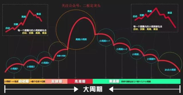市场情绪周期 :市场情绪分为大周期和小周期,一个大周期的每个阶段由多个小周期组成。在实际划分中,由于大周期横跨时间很长无法做到细致化,所以本号采用的是 运行更快的小周期(划分总体大同小异) ,对于短线选手参考意义也更大。