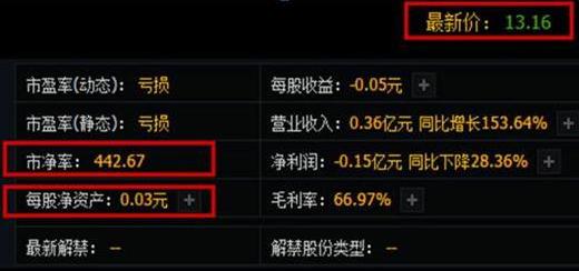 如图所示:该公司每股的价值只有0.03元,但是你每股却要花13元左右去购买,高于价值400多倍。
