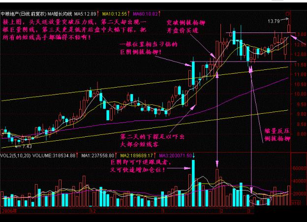 (2)庄家会采用拉高股价,然后顺势下滑,佯装拉高出货的态势,引诱散户抛出。此时有多少抛盘,庄家就会买入多少,成交量巨大并收阴线。由于这种巨量阴线并不是拉高出货,而有倒拔杨柳之气概,今后必有大行情。