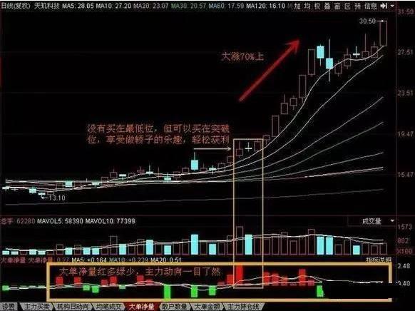观察个股一段时间内大单净量走势变化,如一段时间内大单净量翻红天数增加,股价出现稳步抬升走势,可果断逢低介入。不是非要买在最低位才能赚钱!