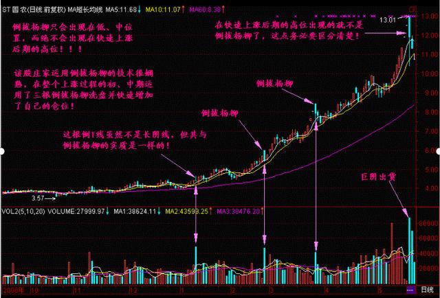 提醒:倒拔杨柳只会出现在离庄家成本不太远的突破重要阻力位、或上升的初、中期等位置,而绝不会出现在拉升股价以后的高位,这点务必要分辨清楚!仔细想想,倒拔杨柳的目的无非是洗盘和快速加仓,但到了高位主力还有什么理由这么做呢?