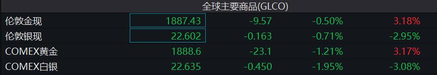 大宗商品方面,黄金、原油全部下跌。Wind行情数据显示,截至发稿,伦敦金现跌0.5%,COMEX黄金跌1.21%,ICE布油跌1.19%,NYMEX原油跌1.04%。