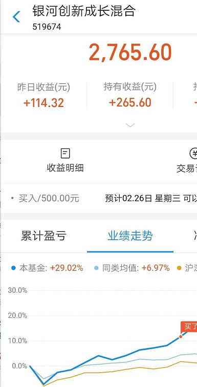 我在2月17日第一次投入1000元的本金买入银河创新,当日最高限额就是1000元,后来第二天又加仓1000元现金,表现还是不错的,本金少,但是盈利能力强。走势仍处于上升的阶段,但是该基金还是属于风险比较大的类型,建议用闲钱投资,长期持有。