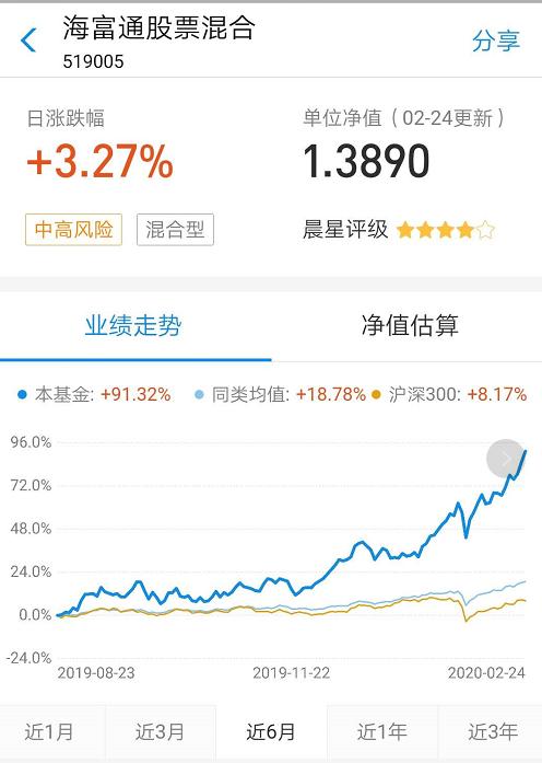 看到海富通最近6个月的表现的更好,增幅达到91.32%。