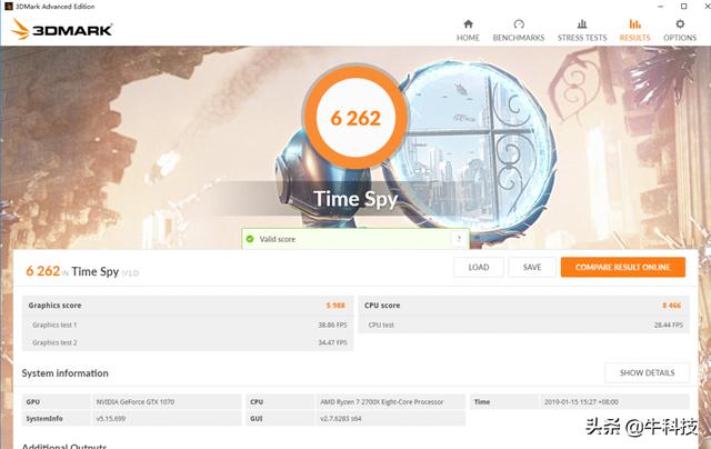 3D Mark TimeSPY 1070得分6262,图形分5988。