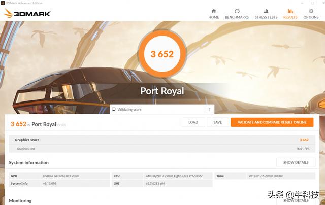 RTX2060单独测试了Port Royal,这是3D Mark推出用于光线追踪的测试,得分3652分。