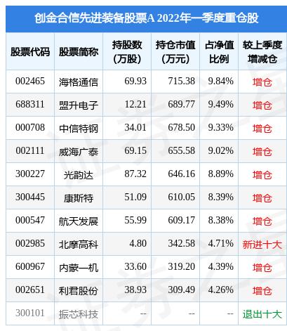 根据2022Q1季报基金重仓股数据,重仓该股的基金共1家,其中持有数量最多的基金为创金合信先进装备股票A。创金合信先进装备股票A目前规模为0.56亿元,最新净值0.8625(4月26日),较上一交易日下跌3.77%,近一年下跌12.39%。该基金现任基金经理为李晗。