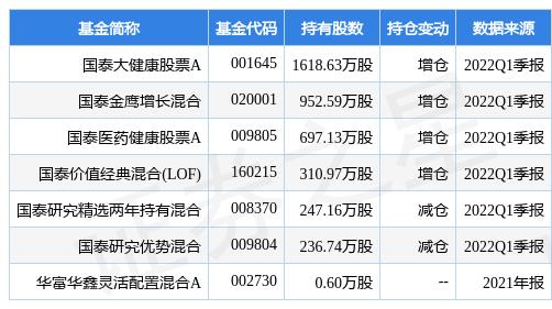 根据2022Q1季报基金重仓股数据,重仓该股的基金共6家,其中持有数量最多的基金为国泰大健康股票A。国泰大健康股票A目前规模为31.34亿元,最新净值2.698(5月23日),较上一交易日上涨0.45%,近一年下跌7.89%。该基金现任基金经理为徐治彪。徐治彪在任的公募基金包括:国泰研究精选两年持有混合,管理时间为2019年12月24日至今,期间收益率为64.02%;国泰金鹰增长混合,管理时间为2020年7月24日至今,期间收益率为-2.85%;国泰价值经典混合(LOF),管理时间为2020年7月24日至今,期间收益率为5.24%。