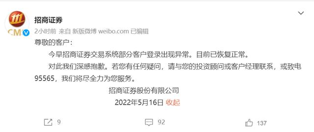 随后不久,招商证券在其官方微博中发布通知称,“今早招商证券交易系统部分客户登录出现异常。目前已恢复正常。”