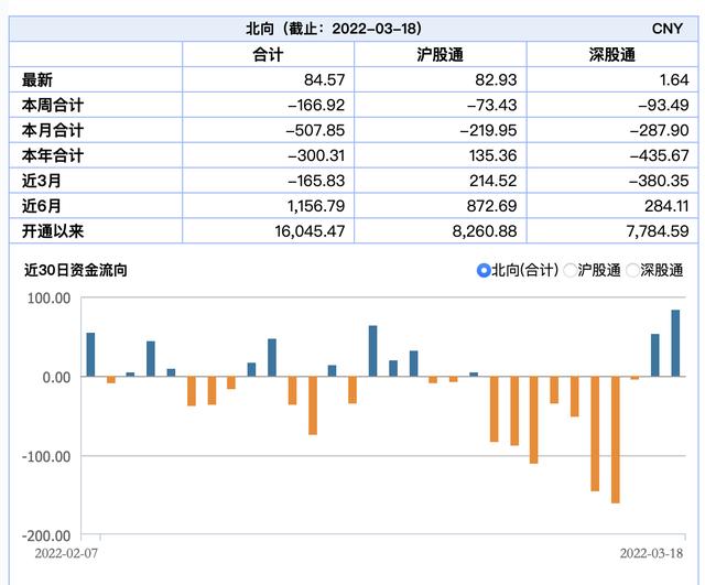 3月18日北向资金合计净买入84.57亿元,其中沪股通净买入82.93亿元,深股通净买入1.64亿元。本周合计净流出166.92亿元,其中出现了连续两日超百亿元的净流出,沪股通合计净卖出73.44亿元,深股通合计净卖出93.49亿元。