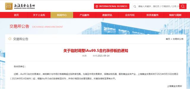 上海黄金交易所:9月15日起调整iAu99.5合约涨停板至60%