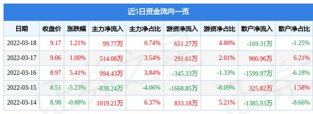 资金流向数据方面,上个交易日主力资金净流入99.77万元,游资资金净流入651.27万元,散户资金净流出169.31万元。近5日资金流向一览见下表: