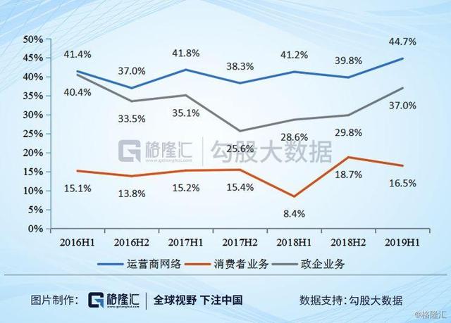除去核心运营商业务之后,公司消费者业务1H19同比下滑明显,之后也不太有好的表现。政企业务方面中兴主要布局NB-IoT、Massive MIMO、边缘计算等技术研究1H19呈现出一定回暖态势,毛利率有所修复,我们预计随着5G网络推动,中兴将在政企业务中稳健发展,保持10%的增速。